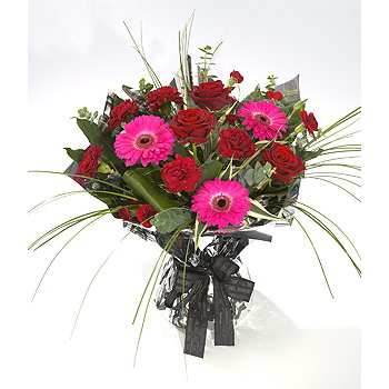An elegant aqua pack of beautiful red Roses and pink Gerbera. A traditional and romantic gift.
