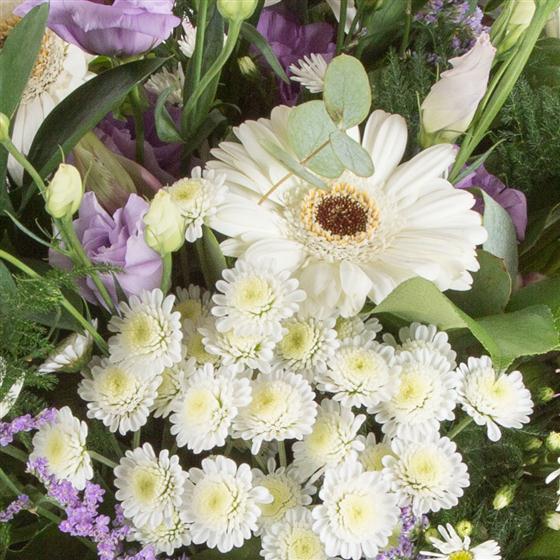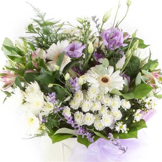 A crisp looking hand-tied bouquet of white and lilac blooms mixed with delicate foliage.