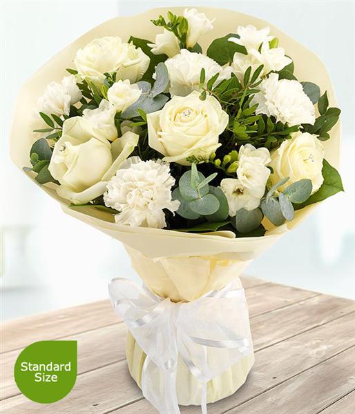 Includes White Roses, White Freesias, White Carnations, Eucalyptus and Pistache.