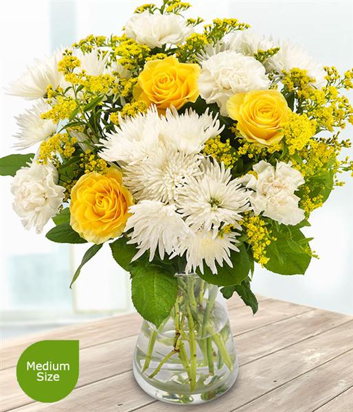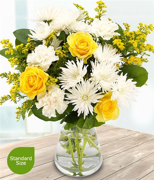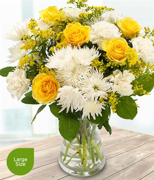 A glorious bright yellow Rose and white Chrysanthemum and Carnation bouquet, with a touch of yellow Solidago.