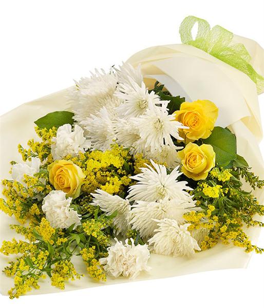 Yellow Roses, Yellow Solidago, White Spray Chrysanthemums, White Carnations, Salal.