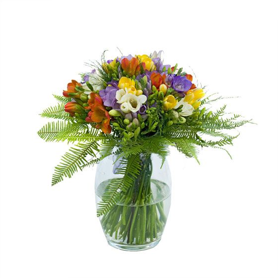 A compact hand-tied bouquet of mixed freesia and foliages. Simple and elegant delivered in a vase. The vase used may vary to the one shown in the picture depending on availability.