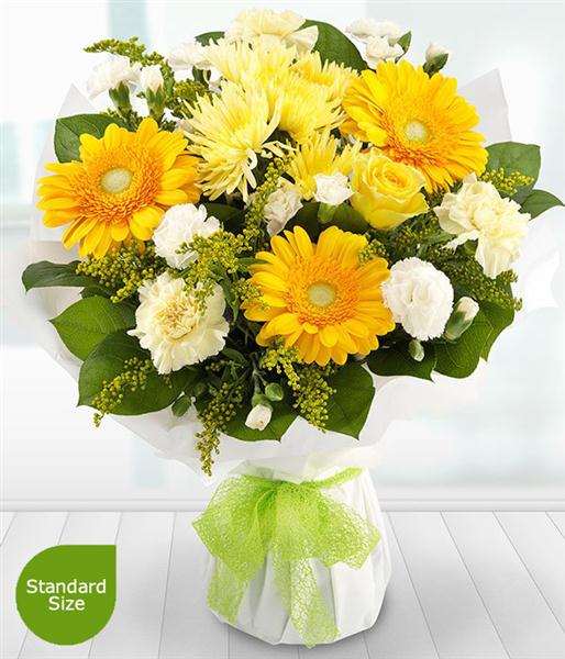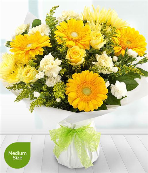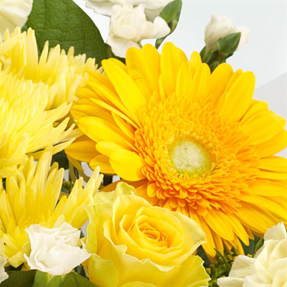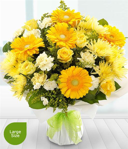 Designed with Yellow Roses, Yellow Gerberas, Yellow Solidago, Yellow Spray Chrysanthemums, Yellow Carnations, White Spray Carnations and Salal.