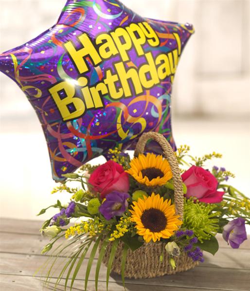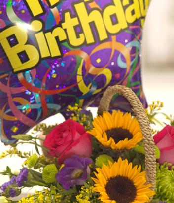 A colourful, sunshine basket arrangement containing bright Sunflowers and hot pink scented Roses. A simply stunning, fuss free flower arrangement. A balloon this makes this an ideal birthday gift.
