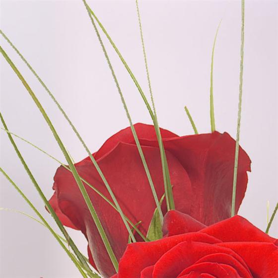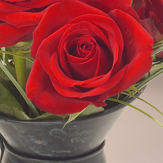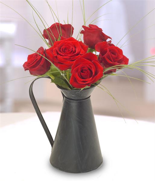 A hot and passionate arrangement containing a half dozen red roses and foliage delivered in a jug or something similar depending on availability.