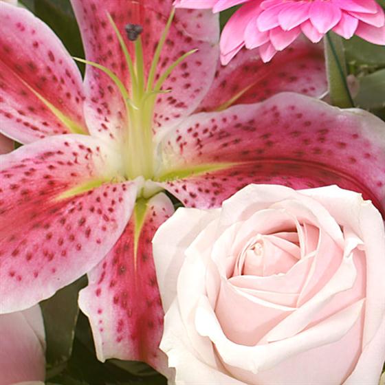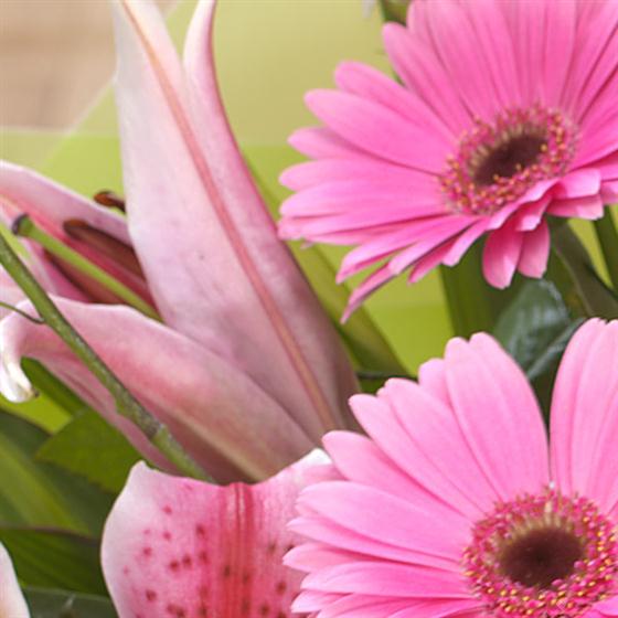 A show-off aqua pack hand-tied of pink Lilies, pale pink Roses and Germini.