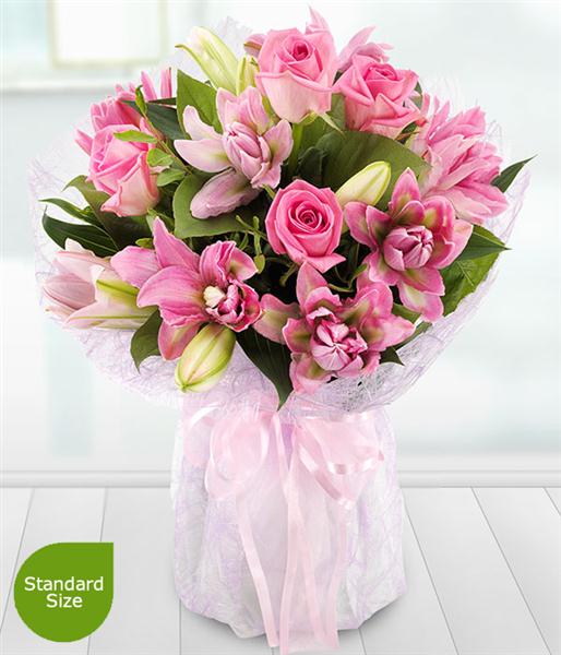 A luxurious pink Rose and Lily aqua pack bouquet exquisitely presented.