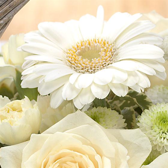 Pale and interesting? A white and cream basket arrangement of Roses, Germini, Carnations and Chrysanthemums.