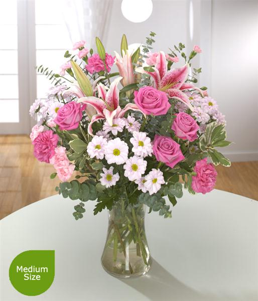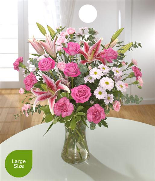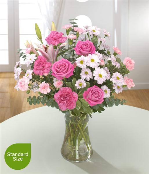 May include Pink Roses, Pink Lilys, Pink Carnations, Pink Spray Carnations, Pink Spray Chrysanthemums and mixed greenery.