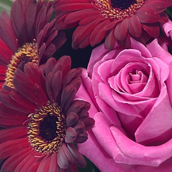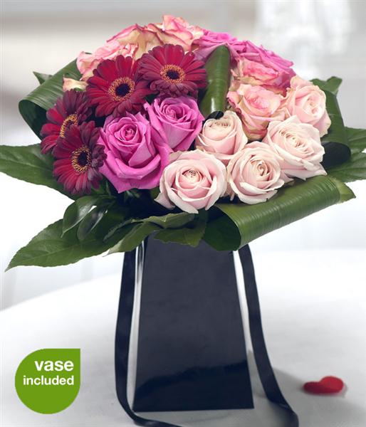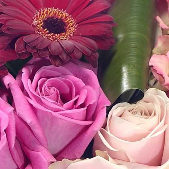 A luxurious bouquet featuring pink Roses, complemented perfectly by deep red velvety Germini. Striking Aspidistra and Aralia leaves complete this exquisite arrangement.