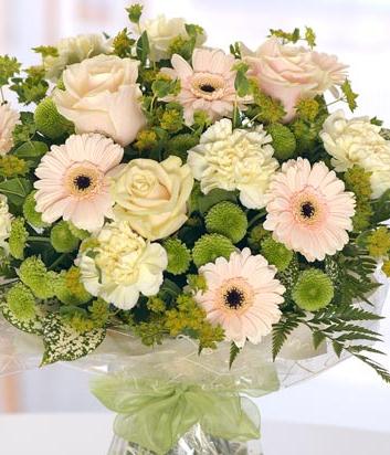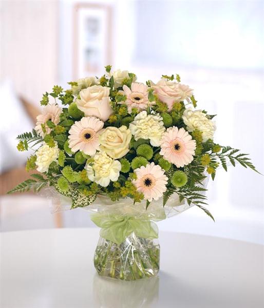 A pretty hand-tied aquapack bouquet of pastel coloured mixed flowers including Roses, Carnations, Mini Gerbera and Chrysanthemums and rich green foliage.