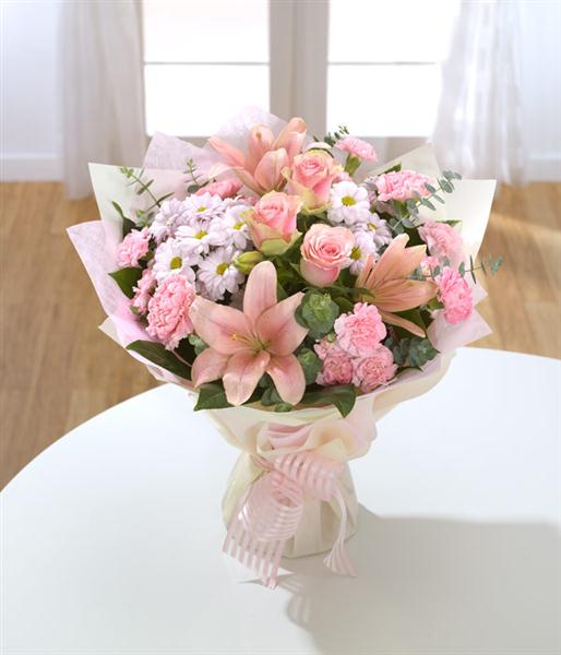 beautiful mix of pinks in a florist choice aqua pack hand-tied.