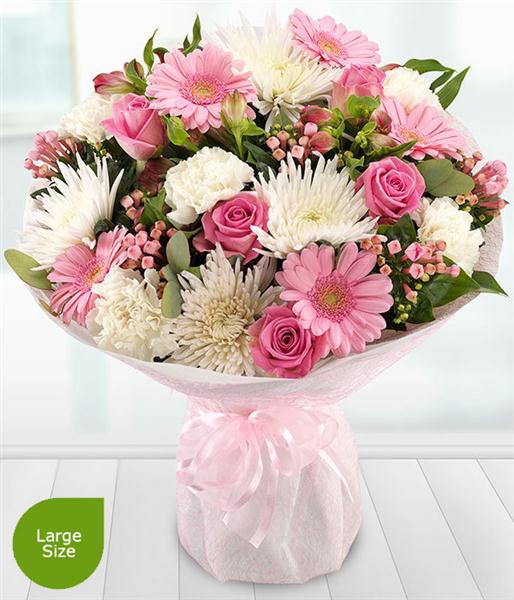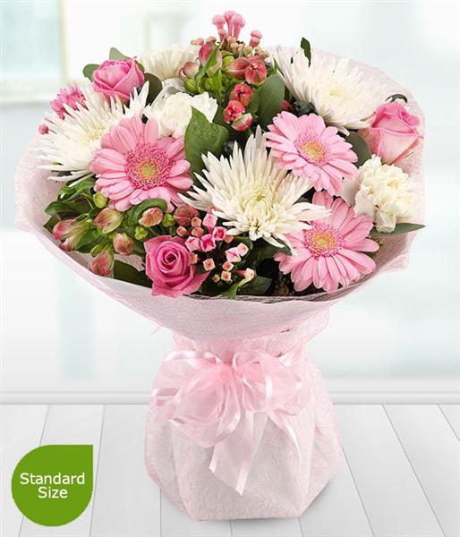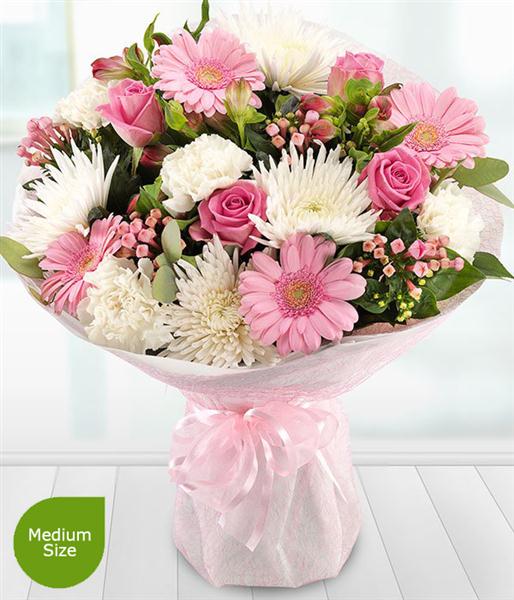 An attractive pink and white aqua pack bouquet. Beautiful florist choice delivered in water for instant display. Picture for website display only.
