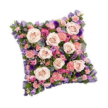 A beautiful pink, mauve and purple cushion featuring pink Roses, Ranunculus, Bouvardia and Carnations with lavender and purple Lisianthus. A mix of Eucalyptus, Ming Fern and variegated Pittosporum completes the design. (17")