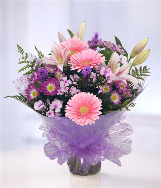 A delightful hand-tied bouquet of mixed flowers in purples and pinks including Gerbera, Lilies, Liatris, Phlox and Chrysanthemums. Beautifully packaged in an aquapack for instant display.