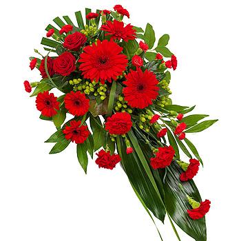 A stunning red single ended spray of Roses, Germini, Gerberas and Carnations all neatly nestled amongst an array of luscious green foliage.