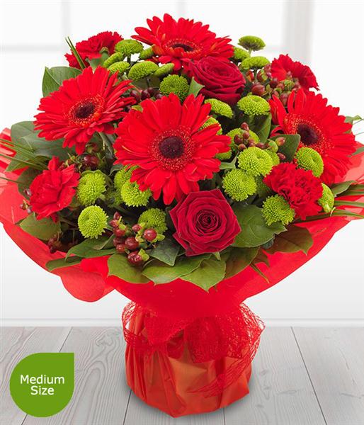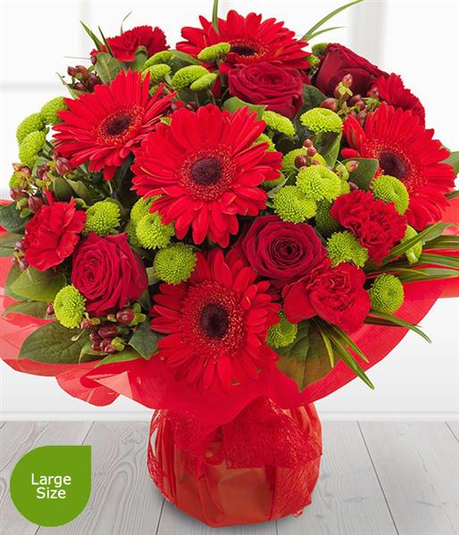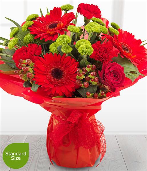 Ruby red Roses, Gerberas and Carnations simply zing against the glorious green Spray Chrysanthemums. With a touch of Hypericum and a flourish of Palm, this bouquet really does stand out from the crowd.