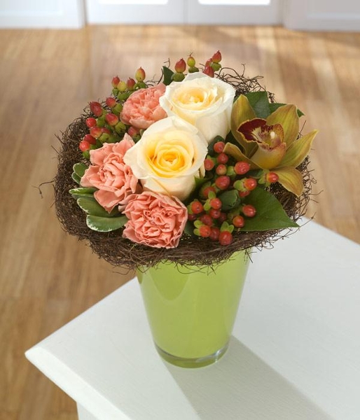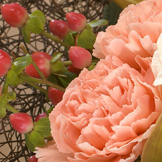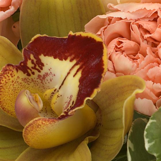 Colour and texture are the name of the game for this vase arrangement. A natural twig collar contains treats of Roses, Cymbidium Orchids, apricot Carnations and Hypericum berries.
