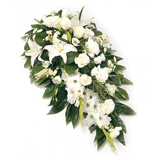 A classic single ended spray of white Roses, Lilies, Eustoma and Gladioli with dark green foliage.