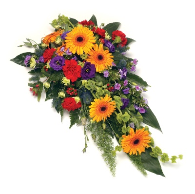Red Carnations, Orange Gerbera, Moluccella, Purple Phlox, Eryngium, Purple Eustoma, Red Hypericum, Mixed Foliage,