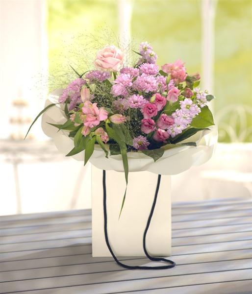 A fragrant English country garden style gift bag collection of roses, stocks, lisianthus and chrysanthemums.