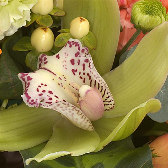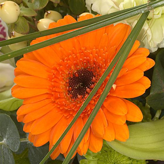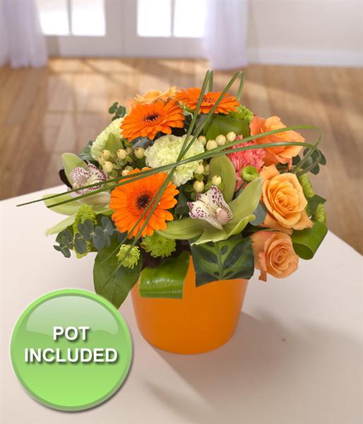 Orange Germini and Roses mixed with green Carnations and Cymbidium Orchid heads. This container arrangement is bursting with colour and vitality.