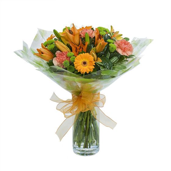 A handtied bouquet of orange Gerberas, Carnations, Lilies, Chrysanthemum and Assorted foliage.