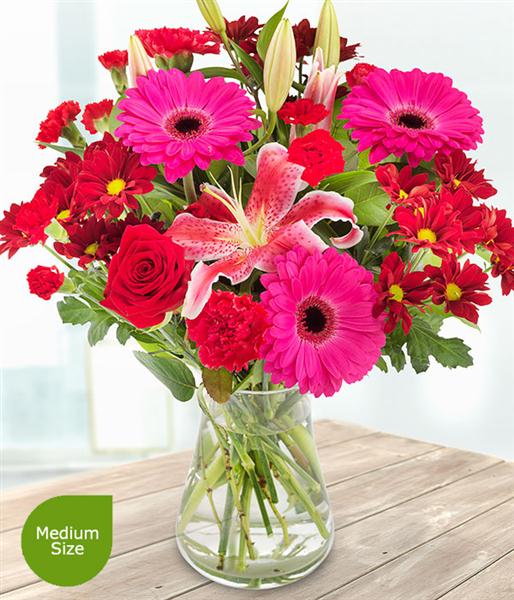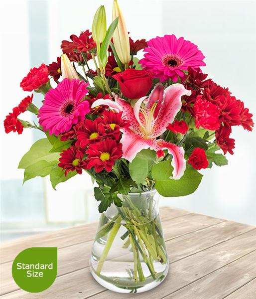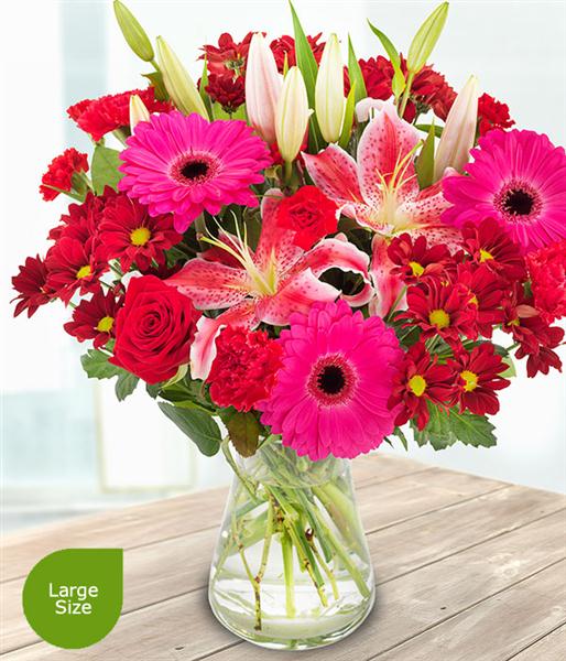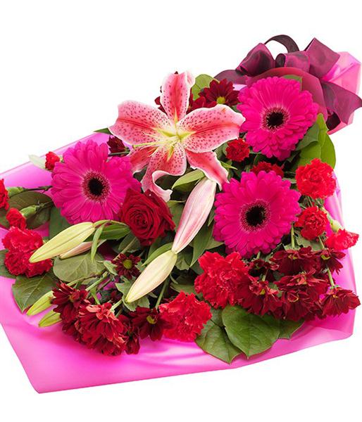 A passionate pink and red flower bouquet. Red Roses and Carnations with pretty pink Lilies, cerise Gerberas and Carnations mixed with burgundy Spray Chrysanthemums.