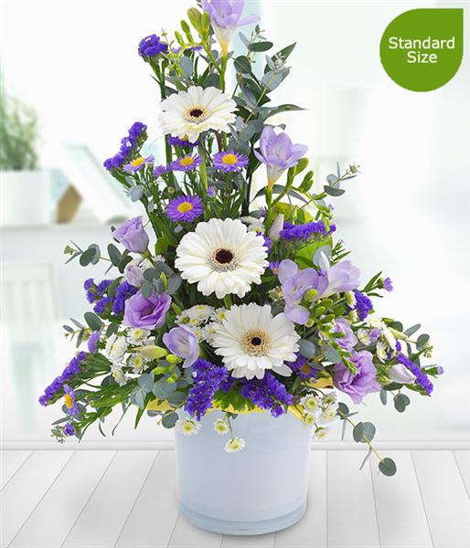 Includes Lilac Freesia, Lavender Lisianthus, White Germini, Lavender Aster, Purple Statis, White Spray Chrysanthemum, Eucalyptus, Variegated Ivy, Salal.