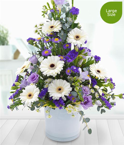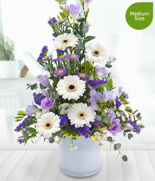 Germinis, Freesias, Lisianthus, Statis and Asters in cool whites, pretty purples and lilacs create this enchanting and absolutely exquisite centrepiece.