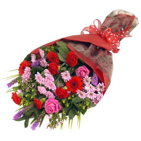 A traditional bouquet of mixed pink and red flowers packaged for easy arrangement at home.