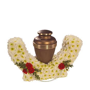 A traditional floral crescent to complement an urn. White spray Chrysanthemums, red spray Roses with a touch of variegated Box and a flourish of Bear Grass. Urn not included.