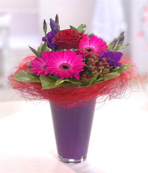 A hot and passionate arrangement of flowers and foliage arranged in a vase, includes a single red Rose.